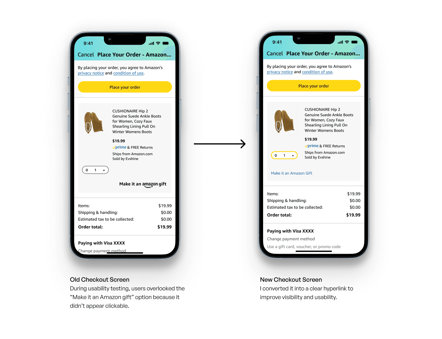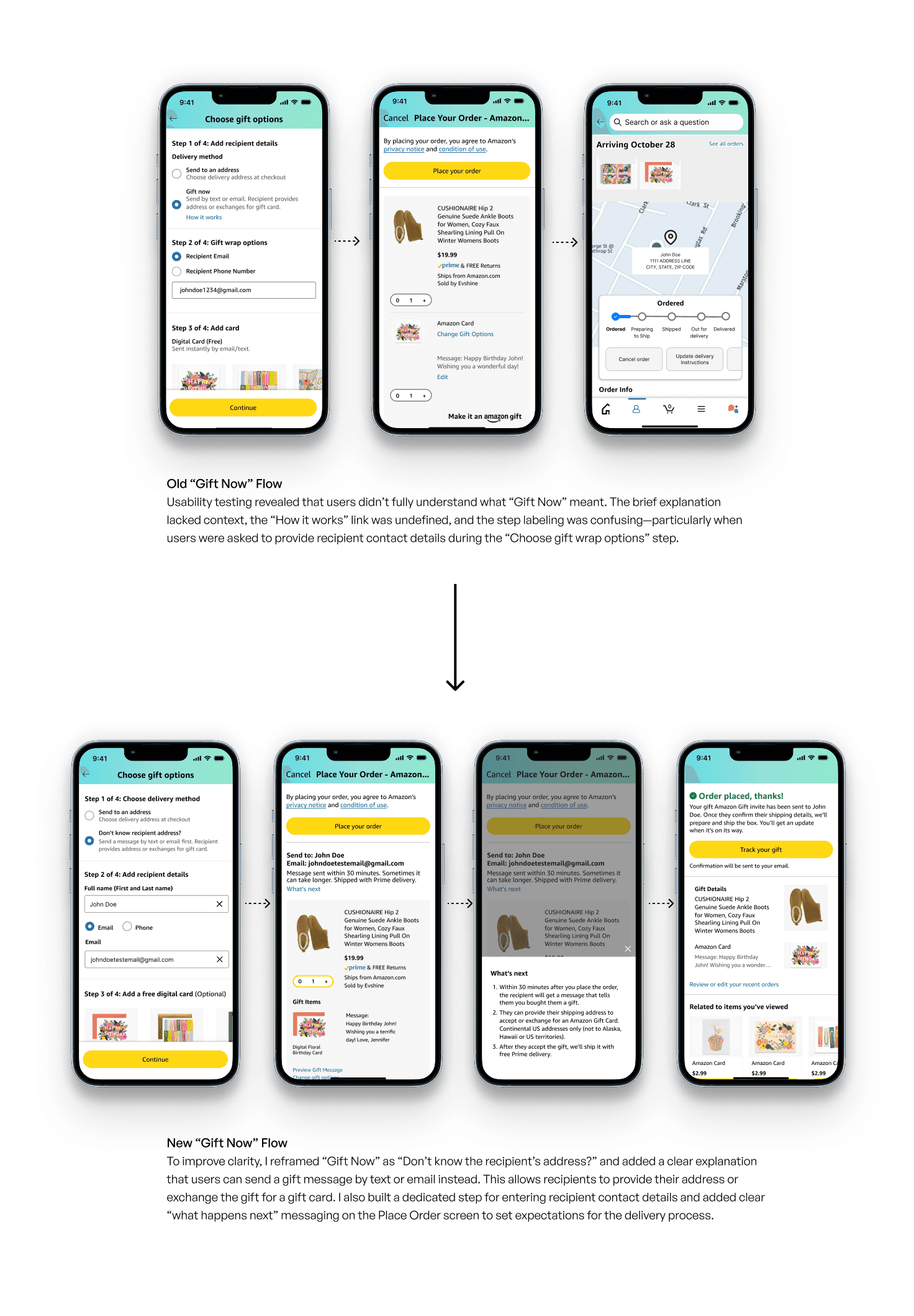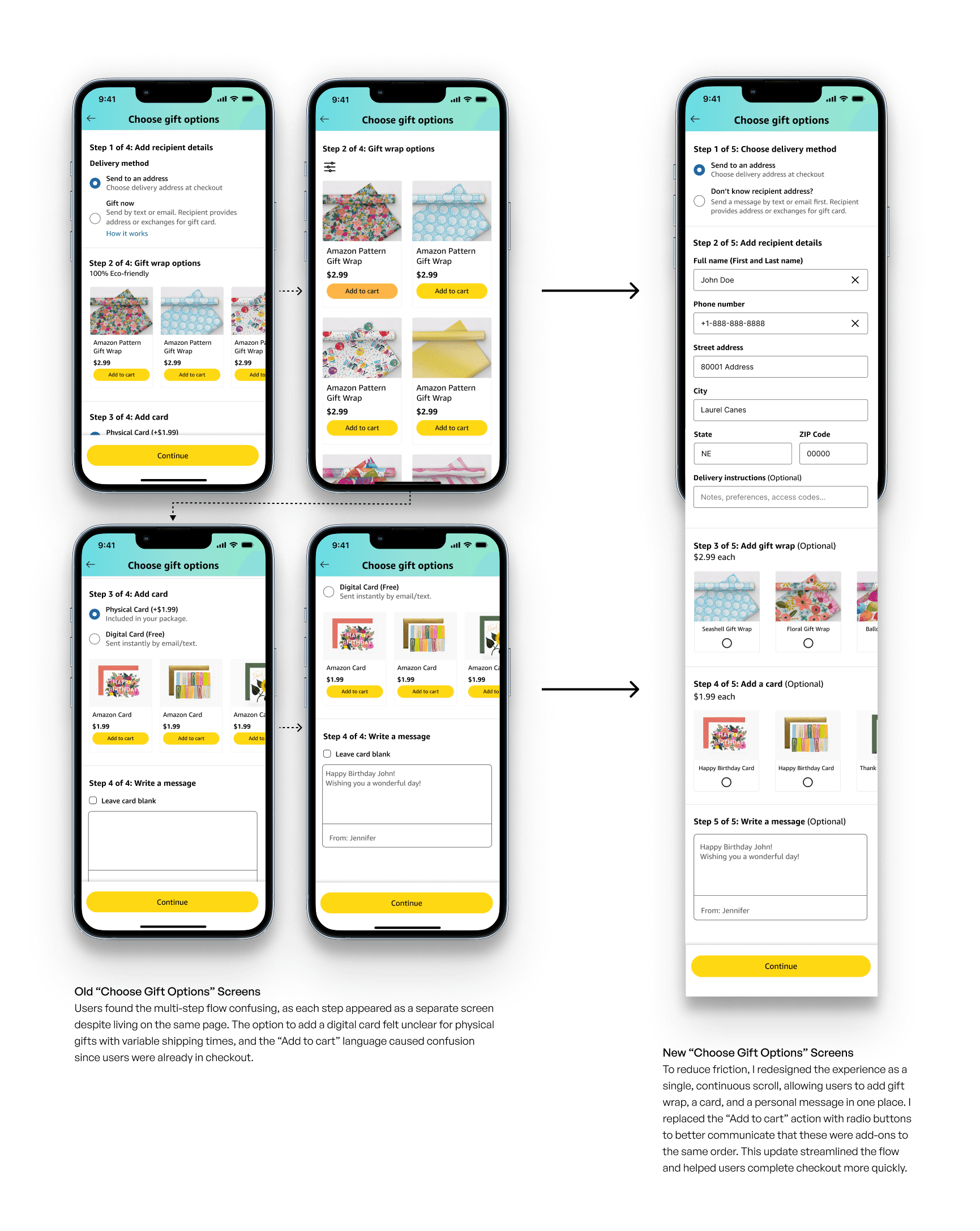 My goal with the new Amazon user flow was to make the added gifting steps feel natural and seamless—just like part of the existing checkout process.