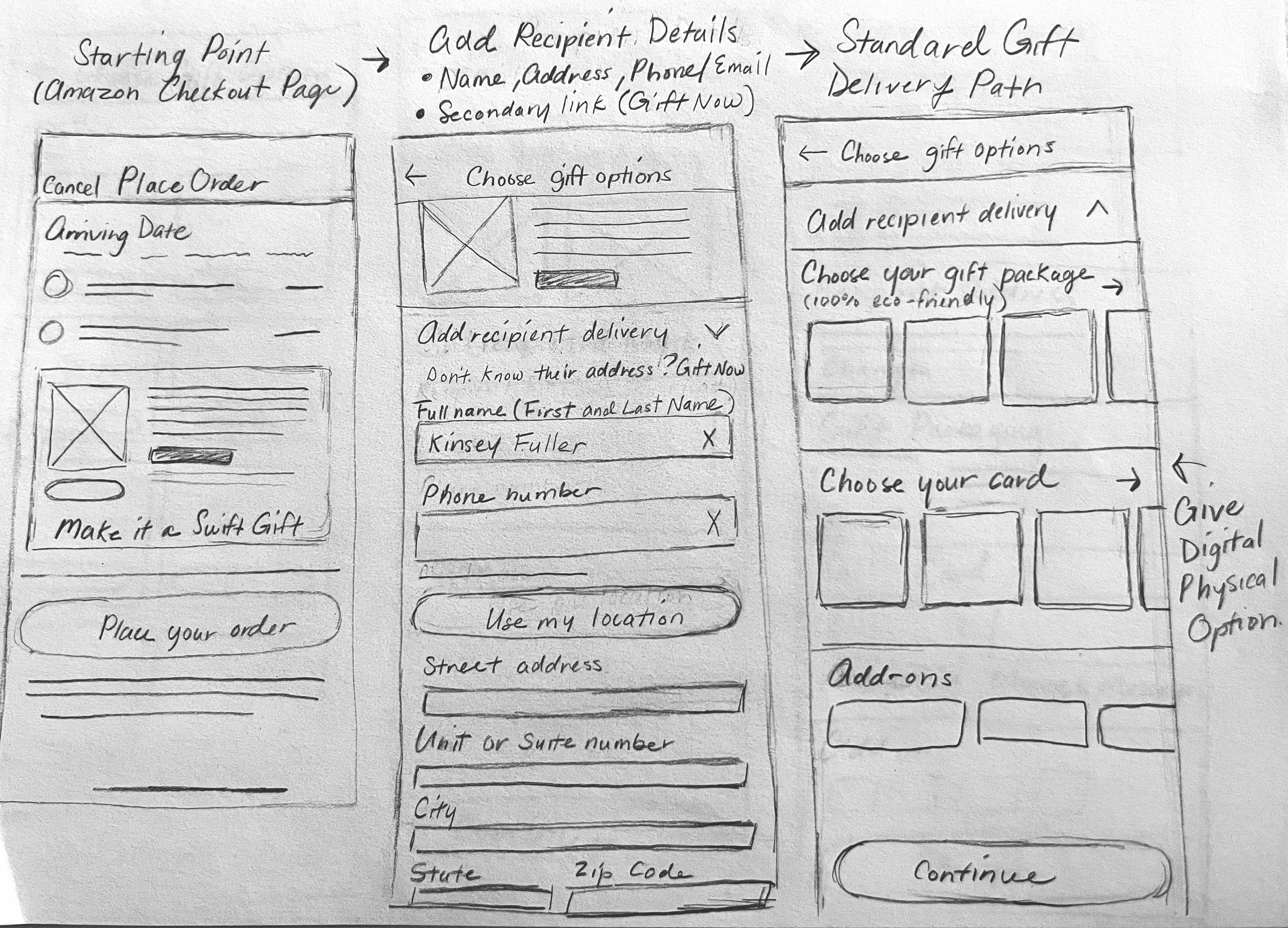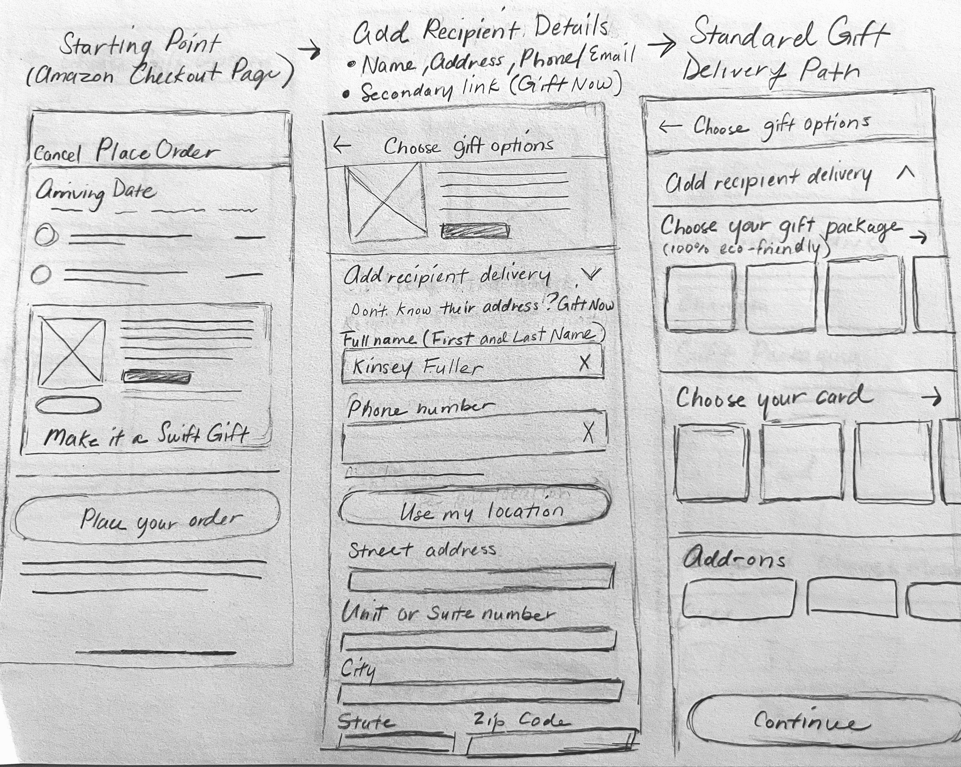 I sketched key screens to explore how users could customize and preview gifts within Amazon’s interface. One of the challenges was making the new flow feel efficient with Amazon's current checkout flow.