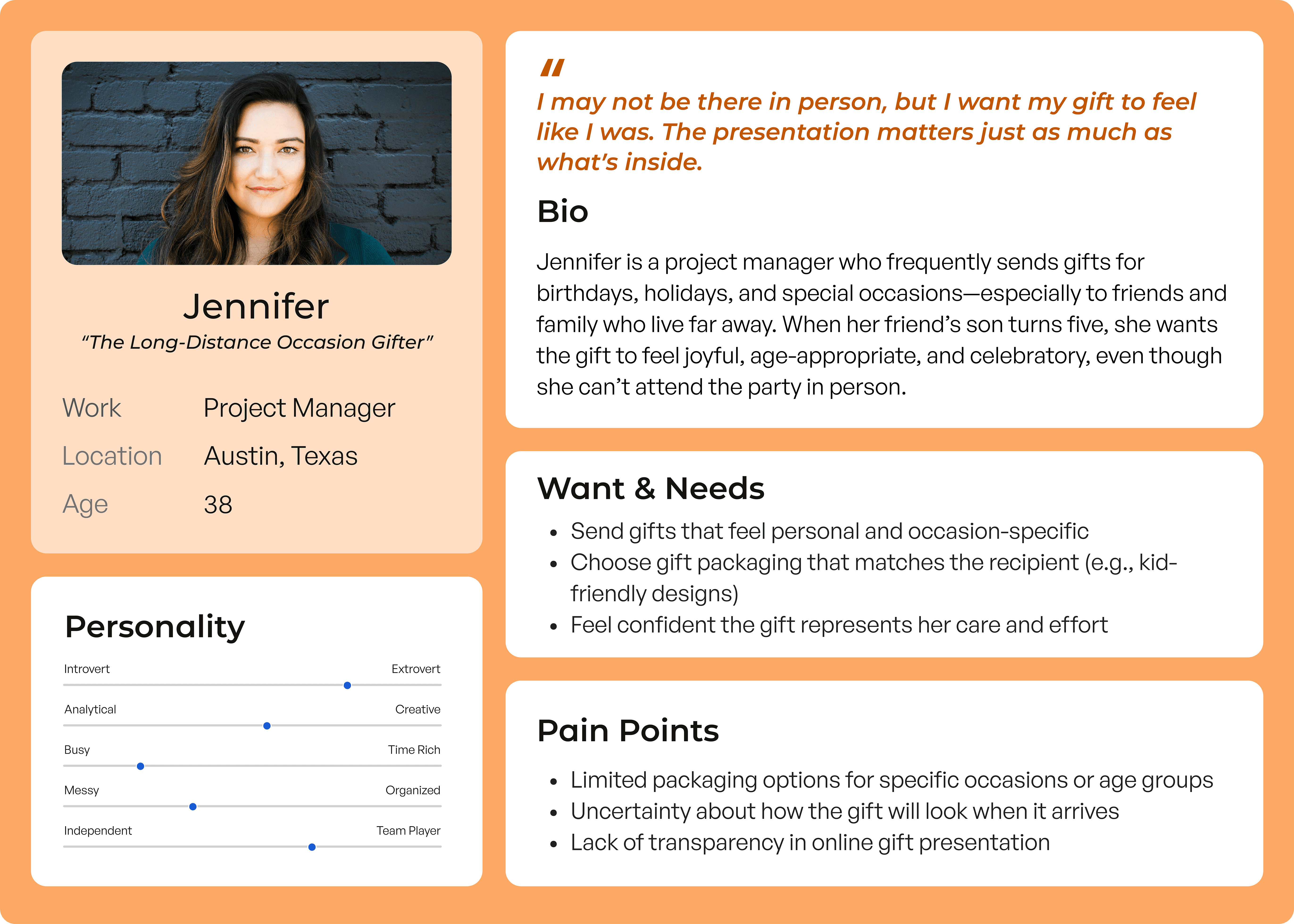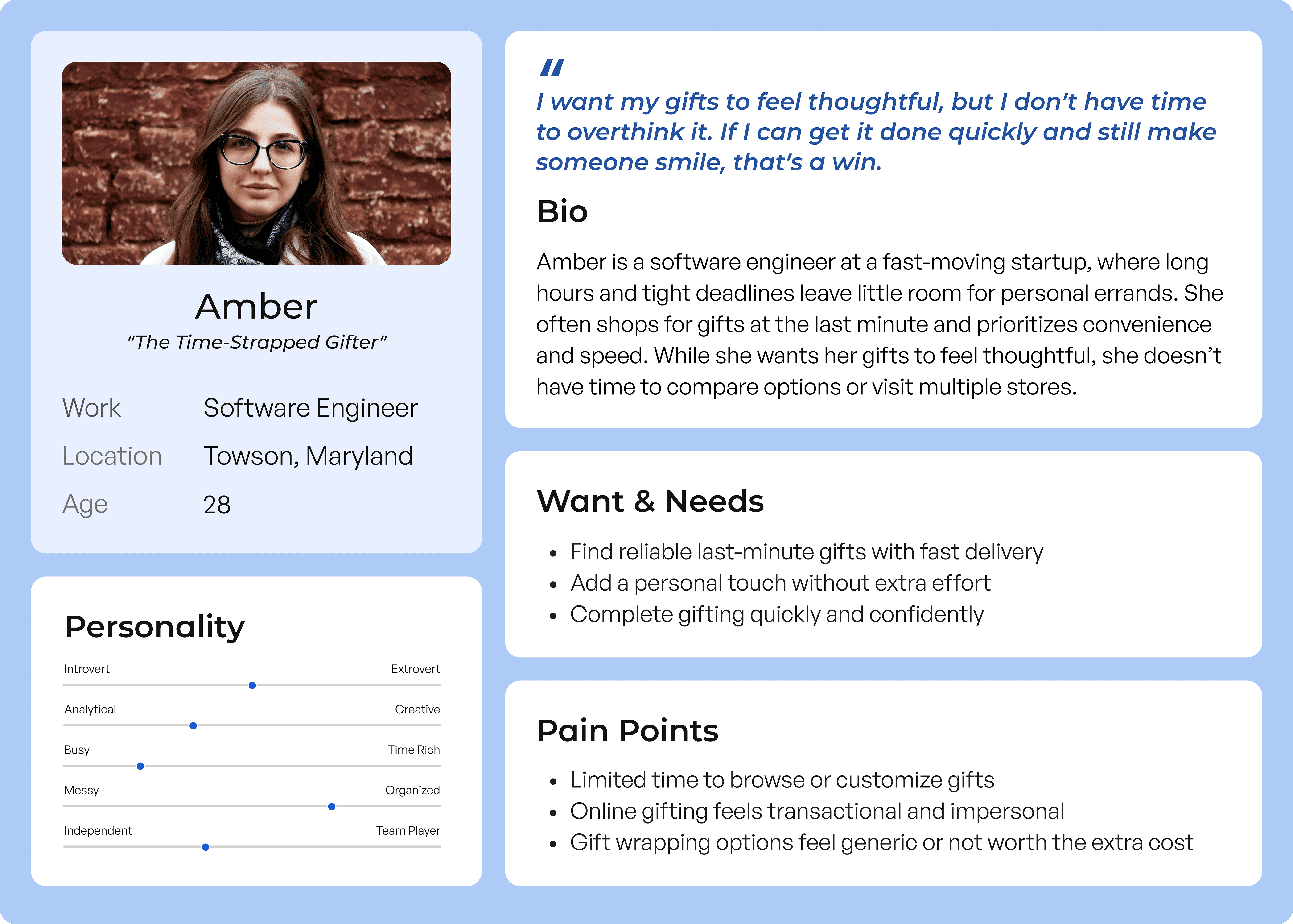 Through my research, I identified two distinct gifting behaviors among Amazon customers. While both rely on Amazon for speed and convenience, their motivations are different. One group prioritizes speed and efficiency, often shopping last-minute and needing a quick, reliable way to send thoughtful gifts. The other prioritizes emotional impact and occasion, focusing on presentation and personalization—especially when gifting from a distance.