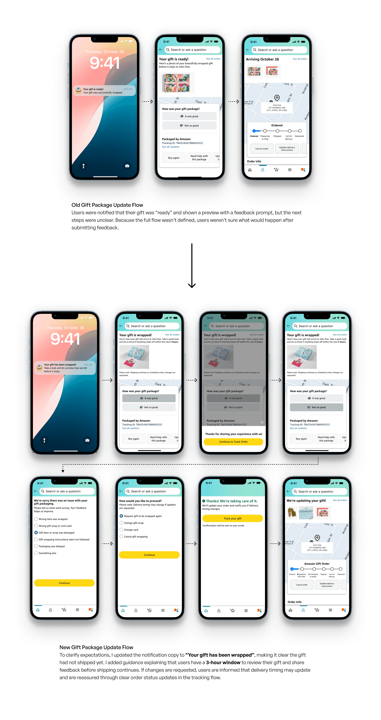 Through research and usability testing, I addressed key pain points around personalization, clarity, and post-checkout reassurance. The final solution streamlines gift customization while giving customers greater confidence through clearer order status and gift preview feedback.